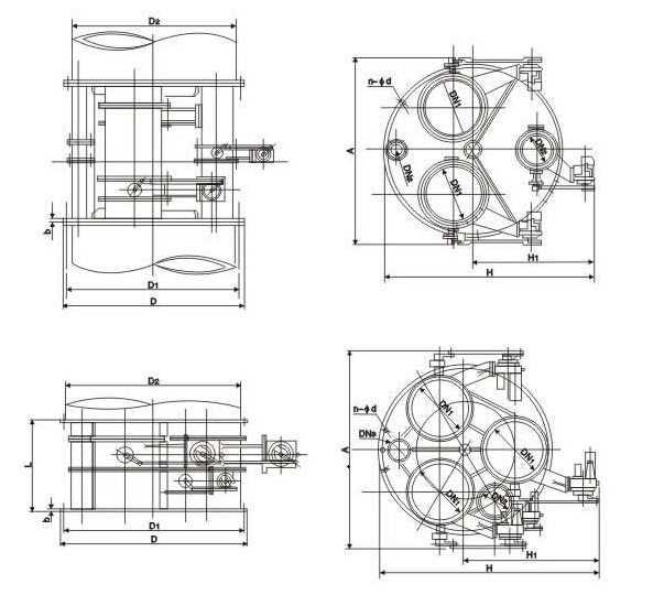 阀组型号 | D | D1 | L | b | n-Φd | A | A1 | H | H1 | 阀门配制 | 许用流量(m3/h) | 重量(kg) | 对应管道 |